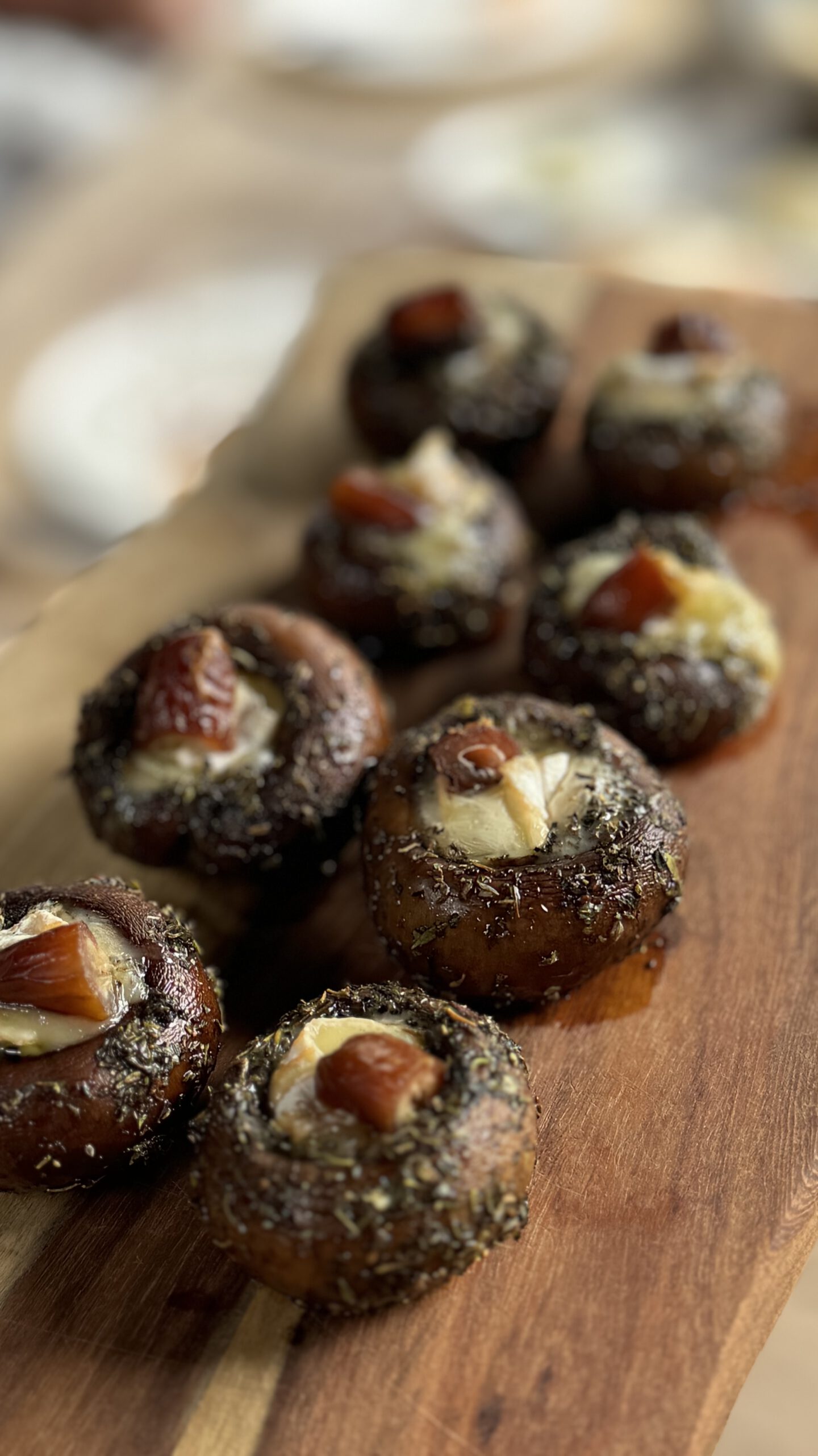 - Haal de pit uit de dadels en snij of hak deze fijn en doe een beetje dadel op de champignon.